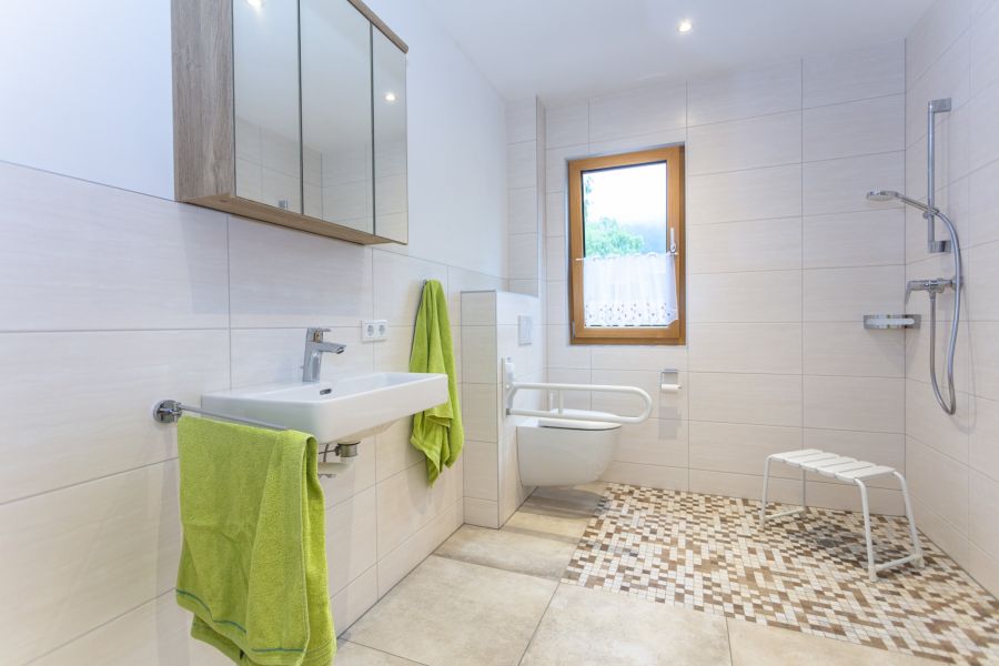 Die Ferienwohnung im Erdgeschoss ist behindertengerecht und rollstuhlgängig mit zwei Schlafzimmern und zwei Bädern, riesiger eingezäunter Terrasse und einem Garten ausgestattet. Im sonnendurchfluteten Wohn- und Essbereich im Erdgeschoss steht ein Tisch für 10 Personen.
